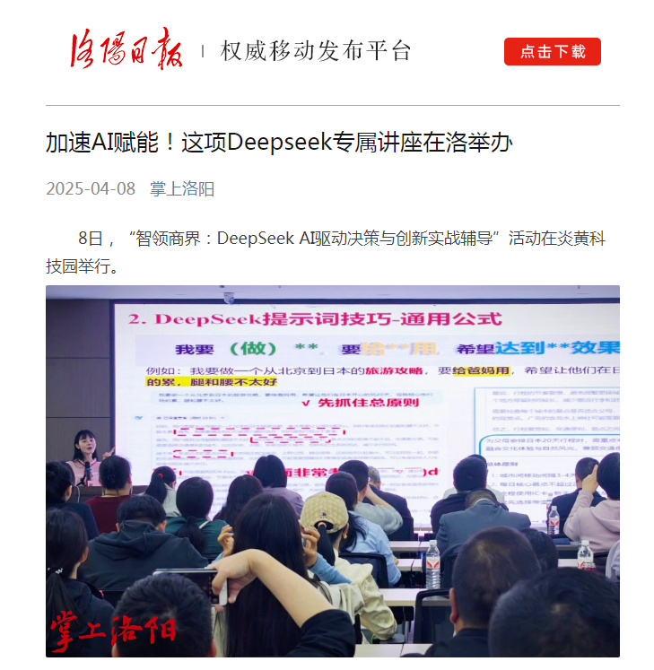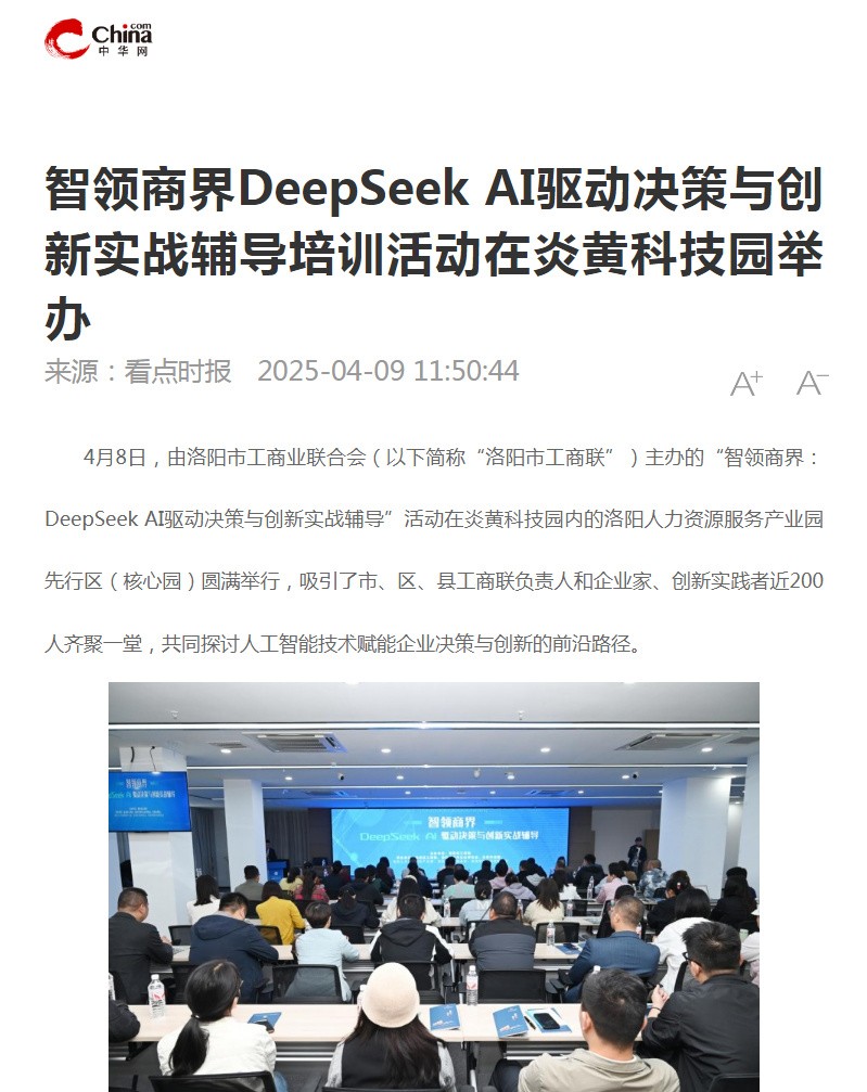 4月8日,“智領(lǐng)商界:DeepSeek AI驅(qū)動(dòng)決策與創(chuàng)新實(shí)戰(zhàn)輔導(dǎo)”培訓(xùn)活動(dòng)在炎黃科技園舉行,轉(zhuǎn)發(fā)洛陽(yáng)日?qǐng)?bào)、中華網(wǎng)的相關(guān)報(bào)道——